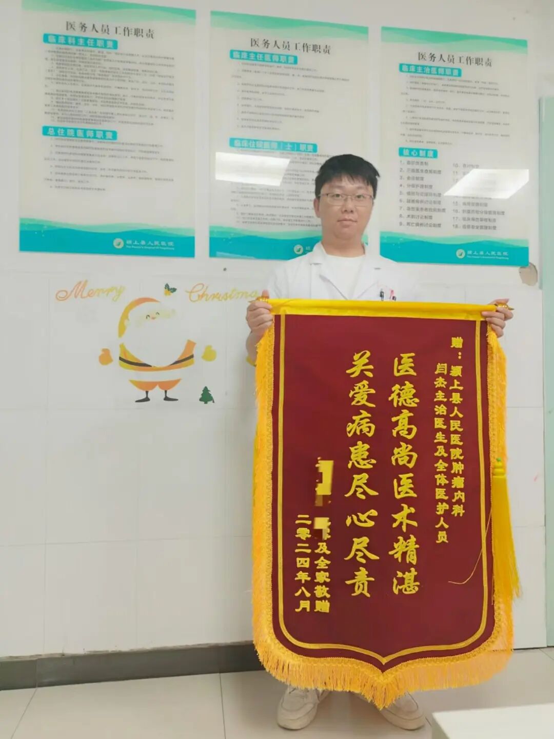 8月27日上午,一面锦旗被一位患者家属亲手交到了肿瘤科闫杰医师的手中,上面写着“医德高尚医术精湛 关爱病患尽心尽责”这16个字,以表达他们的深深感激。