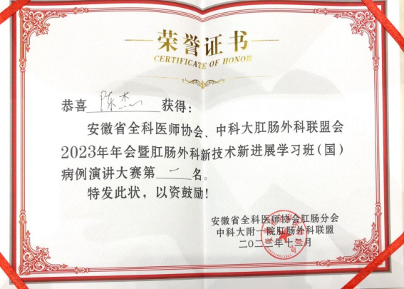 在随后的病例演讲大赛环节,我院普外科一病区陈杰的《直肠脱垂不能一拖了之! 一例ALTEMEIER术病例分享》与来自全省各县市25家医院的同道同台竞技,在激烈的角逐中脱颖而出,荣获本次病例演讲大赛第一名!