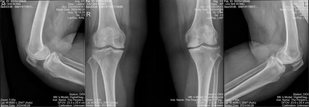 膝关节正侧位片X线片提示:双侧膝关节内侧的软骨完全磨损,内侧间隙狭窄,关节缘骨赘形成,初步诊断为双侧膝关节重度骨性关节炎。