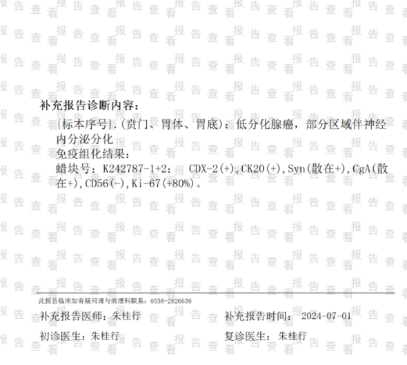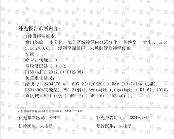 近日,一位18年以前有“胃穿孔”行开腹“胃大部切除”手术史,合并“再生障碍性贫血”病史10年,需长期输血维持治疗的74岁患者,因黑便5天至我院就诊。病理检查结果为残胃癌。胸、腹部增强CT提示:贲门—胃小弯侧壁增厚,考虑占位,未见明显远处转移。