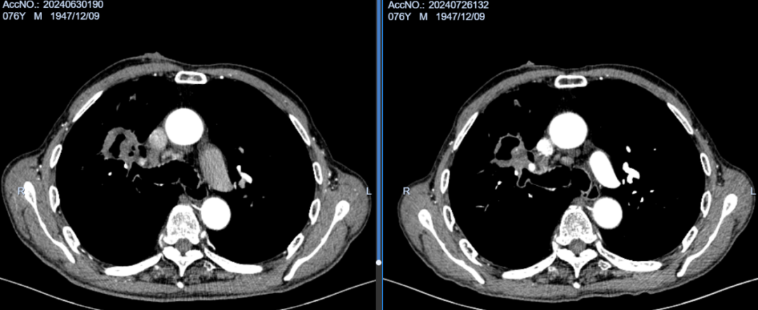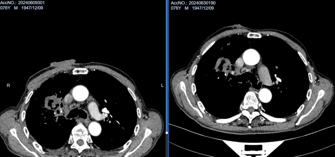 术后2月余,胸壁继发恶性肿瘤基本坏死,肺内原发病灶缩小明显,坏死空洞形成。