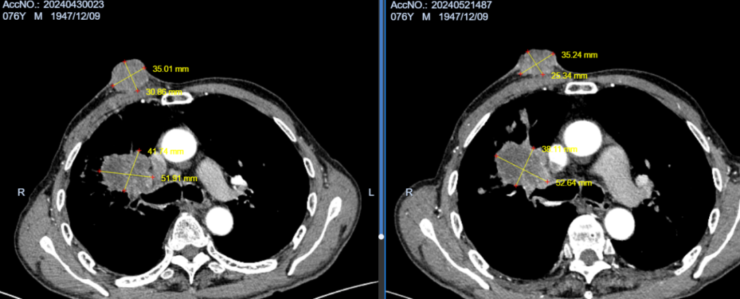 术后3月余,胸壁继发恶性肿瘤完全坏死,胸壁基本愈合,肺内病灶持续变小。