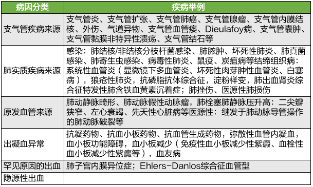 引起咯血的病因众多。根据出血部位进行分类(如气道、肺实质、肺血管),另有出凝血异常导致的咯血、罕见病因导致的咯血。部分咯血患者即使接受了包括CT及支气管镜检查在内的仔细评估后仍未发现病因,称之为隐源性咯血或者特发性咯血。