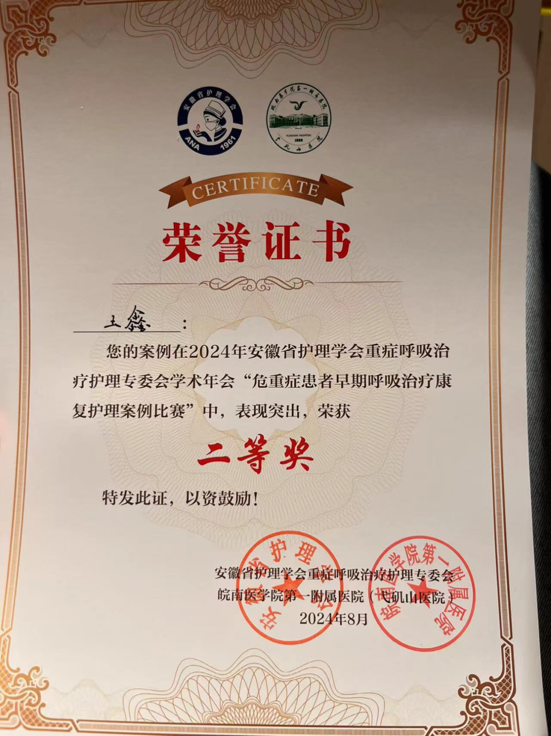 为贯彻落实《公立医院高质量发展促进行动(2021—2025年)》,建设高质量人才队伍,提升专科护理质量。8月22日—25日,我院呼吸与危重症医学科二病区护士长王鑫参加了由安徽省护理学会主办,皖南医学院弋矶山医院承办的安徽省重症呼吸治疗护理专委会学术年会暨危重症患者早期康复护理新进展培训班。并积极参与危重症患者早期呼吸治疗康复护理案例比赛。